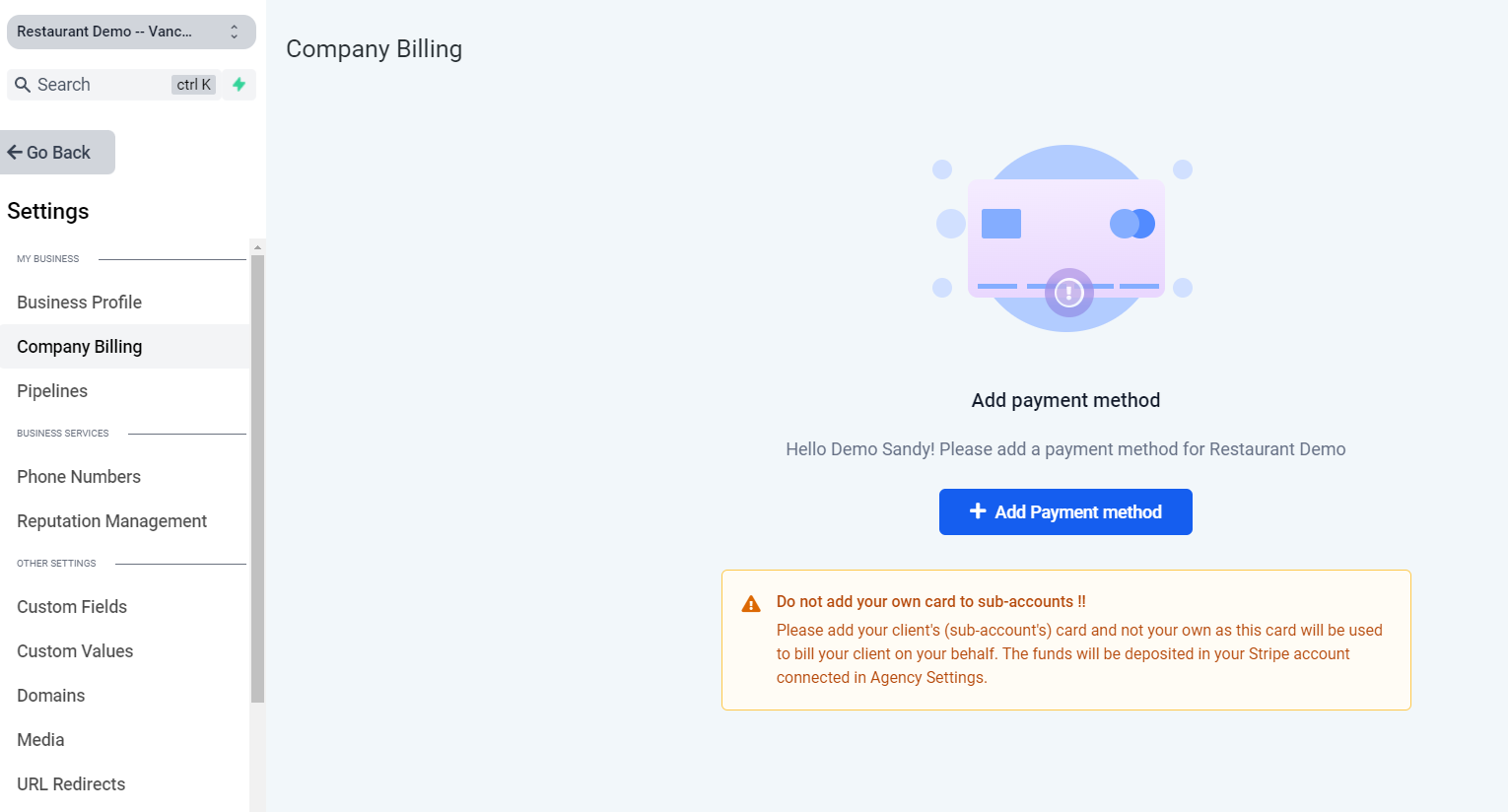 <figure><img src="https://3388044494-files.gitbook.io/~/files/v0/b/gitbook-x-prod.appspot.com/o/spaces%2FC0wfLyjtRM04a7Aooz68%2Fuploads%2FWHbJyMUwVRZOVi7LB7bR%2Fcompany%20billing.PNG?alt=media&#x26;token=22d364cd-276e-4af9-92a0-734b3061b53a" alt=""><figcaption><p>Setting -> Company Billing</p></figcaption></figure>