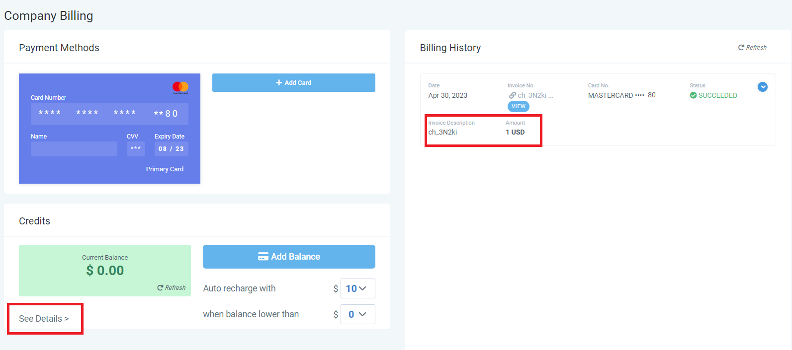 4. To view the full company billing transactions, you can click on 'See Details' under the Credit section.<br>