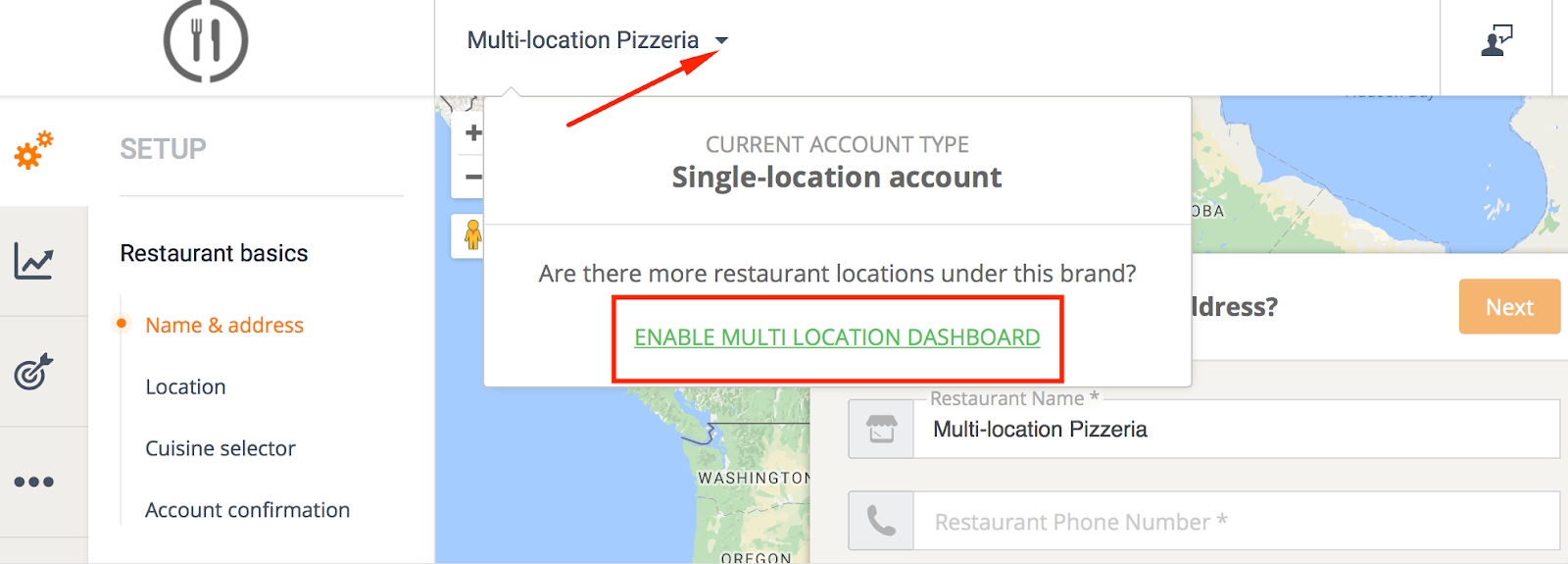 For multi-location restaurants, click on the extra options arrow next to the restaurant name in the restaurant admin panel to enable the multi-location dashboard: