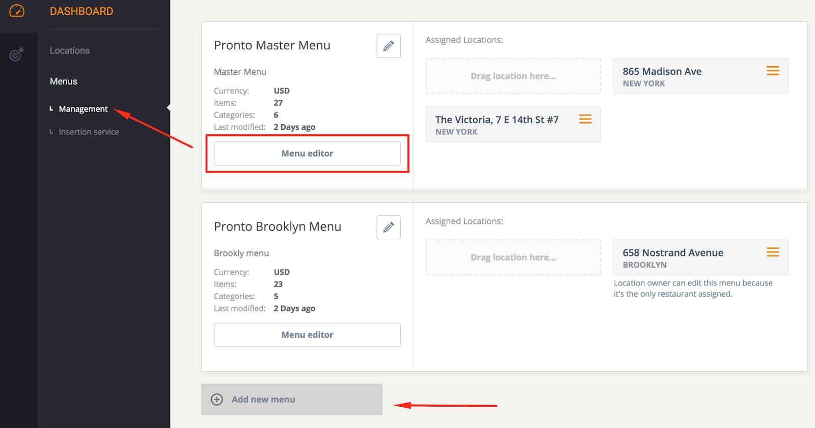 In case not all locations can function with one menu, the account holder can simply create multiple versions by duplicating an existing one or starting from scratch. Create as many menus as needed and assign the locations to the menus by dragging them to the right menu.